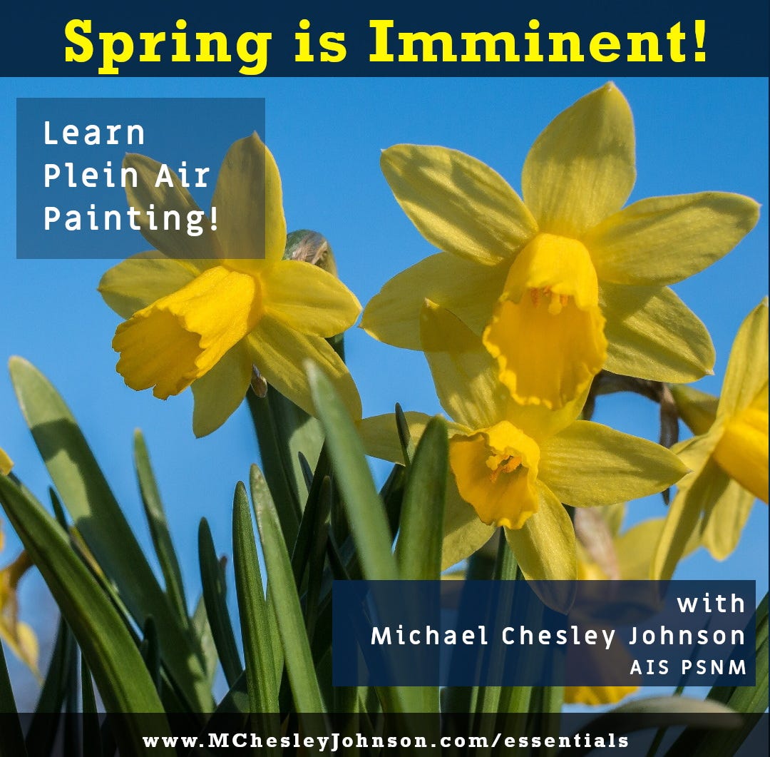 With that in mind, I’ve posted new discount codes for my Plein Air Essentials courses. Learn plein air painting, or if you’re already an expert, up your game! Find out more here: https://www.mchesleyjohnson.com/essentials